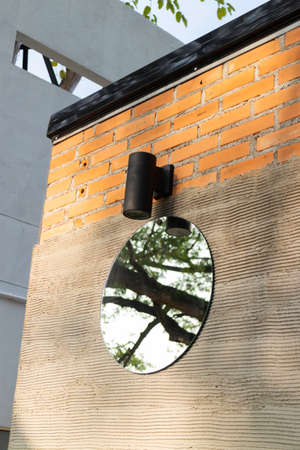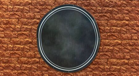 Round canvas banner on the decorative brick wall