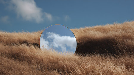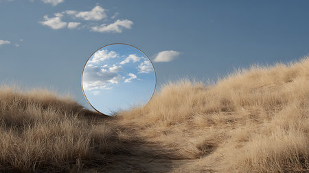 Generative AI Image of Circle Mirror in Green Meadow with Bright Blue Sky