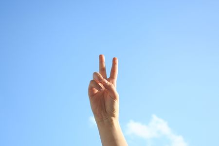 Closeup portrait of a male hand with two fingers up in the peace or victory symbol