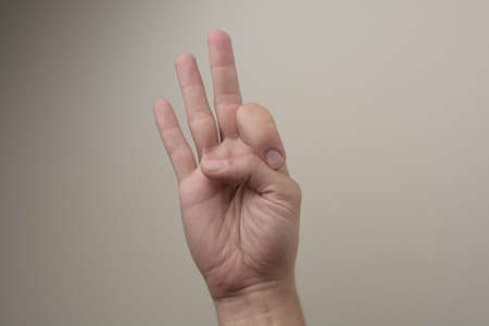 Dramatic colour image of male hand demonstrating sign language number three against black background with empty copy space for editors