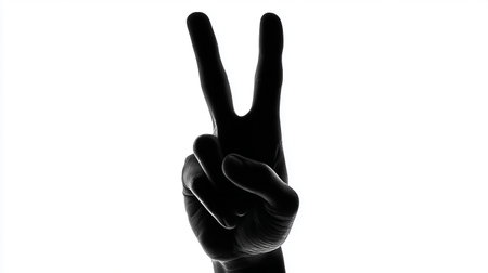 This striking image features a hand with two fingers raised in a gesture of peace, set against a solid black background, ideal for creative projects.