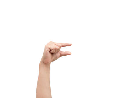 Close-up of hand gesture of picking up something. Male hand holding something invisible isolated on yellow background.