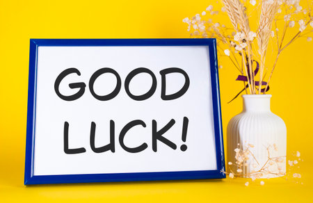 Good luck symbol. Concept words Good luck on beautiful wooden picture frame. Beautiful yellow background with flower vase. Business and Good luck concept. Copy space.