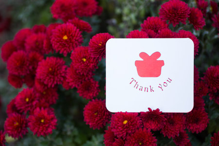 Greeting thanksgiving card surrounded by flowers of red chrysanthemum. St. Valentine day romantic gift.