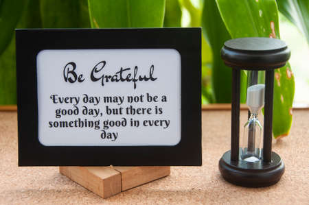 Motivational quote text on notepad with minutes glass - Every day may not be a good day, but there is something good in every day. Motivational concept