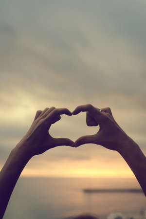 Bright sunset and hands of a man forming a heart shape silhouette on natural oudoors abstract background. Close up on emotional human feeling over sunny seascape shore leisure travel landscape