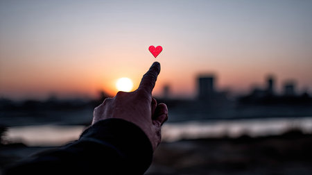 Two hands forming a heart shape against a backdrop of twinkling city lights. High quality illustration