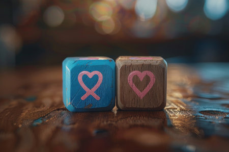 Two wooden cubes with hearts on them. The hearts are pink and blue
