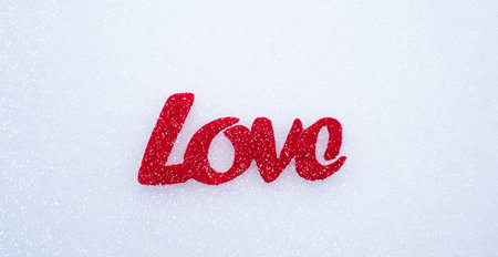 Love message the word LOVE on the snow. Valentine's Day. Banner. Close-up. Top view. Selective focus.