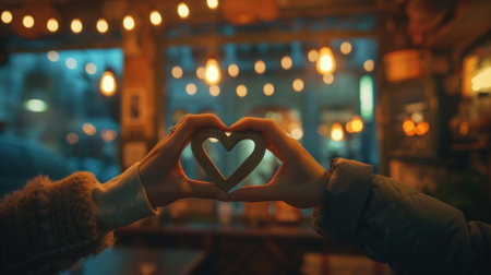 Heart-shaped hands against the backdrop of a cozy cafe, generative ai