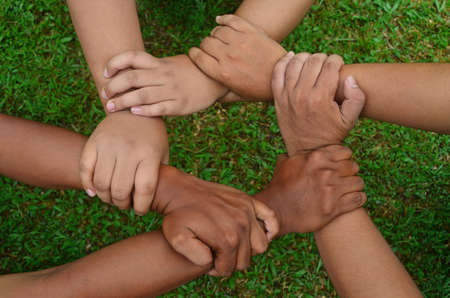 Close up view at group of hands holding together