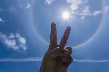 hand showing peace sign on sky background, symbol photo for peace and love