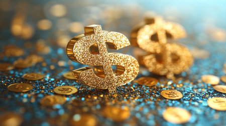 Golden dollar signs shine brightly amidst backdrop of shimmering coins and confetti, evoking sense of celebration and prosperity..