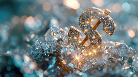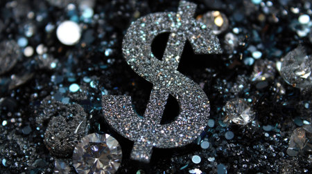 A silver dollar sign sparkles prominently, set against a dark, textured background of gems and glitter. The macro shot composition highlights the brilliance and light reflections of the shimmering elements. Suitable for conceptual illustrations related to finance, wealth, and success, this image is ideal for commercial applications.