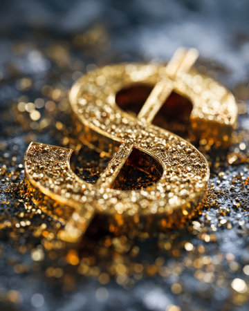 A luminous gold dollar symbol surrounded by shimmering glitter particles, conveying wealth, success, and festive financial celebration.