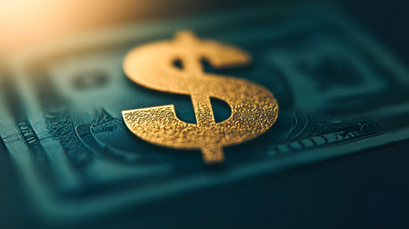 A prominent golden dollar symbol rests atop a dark green currency note, creating a contrasting visual. The background appears solid, punctuating themes of wealth and aspiration.