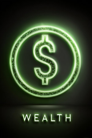 Green Neon Abstract Dollar Sign Glowing On Background with Text WEALTH , Finance Concept.