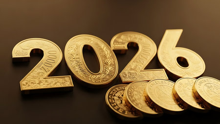 Shiny golden 2026 numbers, intricately designed with decorative elements, rest on dark surface. Several gold coins are stacked in front, symbolizing financial growth and future prosperity.