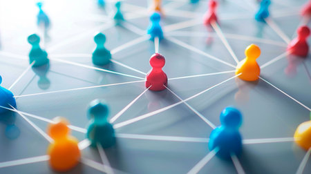Colorful pawns connected by string to symbolize networking and interaction among people