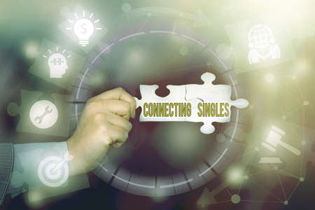 Inspiration showing sign Connecting Singles. Business showcase online dating site for singles with no hidden fees Hand Holding Jigsaw Puzzle Piece Unlocking New Futuristic Technologies.