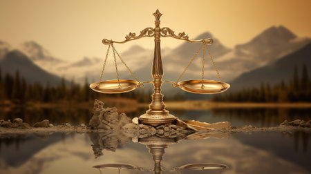 Golden scale balancing on glitter surface representing justice and law