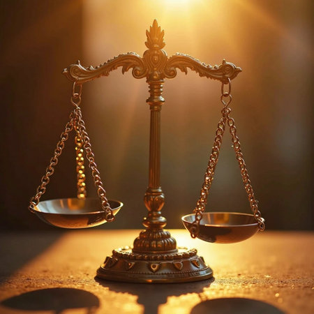 Scales of justice gracefully balance in a sunlit courtroom, adorned with rich details and textures.