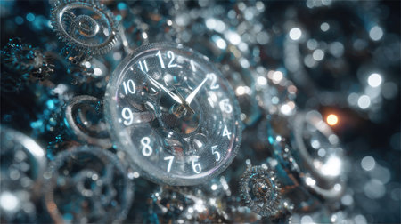 This image showcases a close-up of a transparent pocket watch surrounded by mechanical gears. The composition highlights the watch face with visible numerals and hands. The color palette includes silver and hints of blue. Suitable for commercial or conceptual projects, the photograph implies the passage of time.