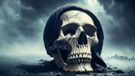 A striking gold-decorated skull sits prominently in a cemetery with a glowing full moon in a dark, moody sky.. AI Generation
