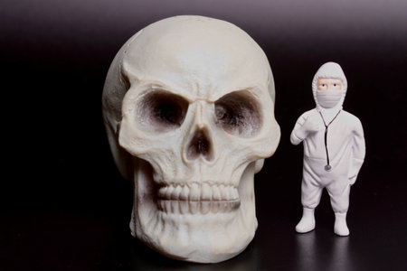A human skull sits next to a glass timer that is counting down to disaster. During the pandemic of the virus.
