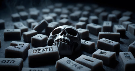 A skull lies amidst sugar tiles with the grim word DEATH emerging among them, creating a chilling scene that marries the sweetness of sugar with the somber reality of mortality. The image is a haunting reminder of lifes fleeting nature, served on a bed of the simplest of pleasures.