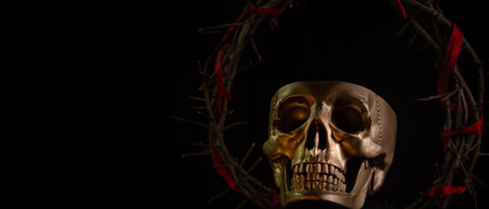 Still life of human skull that died for a long times ,concept of horror or thriller movies of scary crime scene ,The concept of people who die with drugs and Halloween theme, visual art
