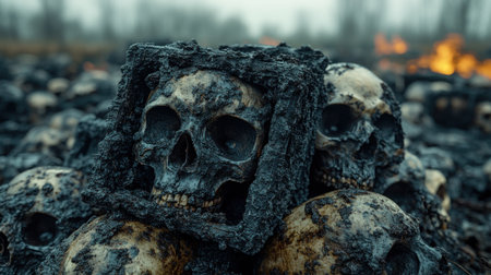 A scene of ash covered skulls among flickering flames stirs deep emotions.