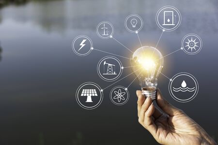 Hand holding light with icons energy sources for renewable, sustainable development, love the world. Ecology concept.