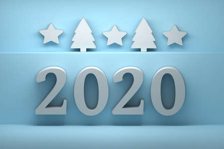 Year 2020 number. Happy New Year greeting card with large 2020 number and large trees and snowflakes on blue background. 3d illustration.