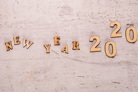 New year number 2020 lined with wooden figures on the wooden surface. Happy New Year.