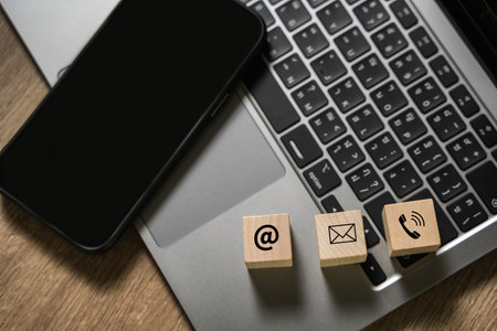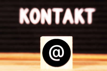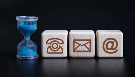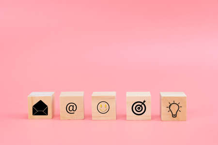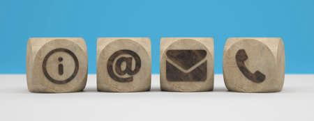 Close-up contact us icon (phone, email, mail ) on wood cube , socail business working and customer service support