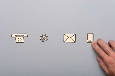 Business customer service concept - male hand placing paper cut communication icons in line on grey background.