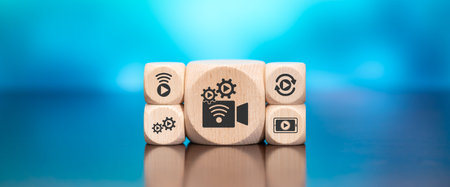 Wooden blocks with symbol of live streaming concept on blue background