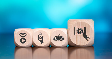 Wooden blocks with symbol of online streaming concept on blue background