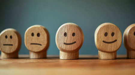 A group of five wooden figures, each with different facial expressions, are arranged on a wooden table. The figures depict emotions ranging from sadness to happiness, showcasing diverse feelings.