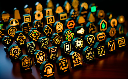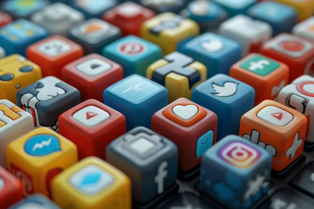 The image showcases a colorful arrangement of message icons crafted from resin, with textures visible. Primarily featuring yellow, red, and blue blocks, each one presents unique messaging symbols. The background appears solid, emphasizing the vibrant colors. This composition evokes a sense of modern communication.