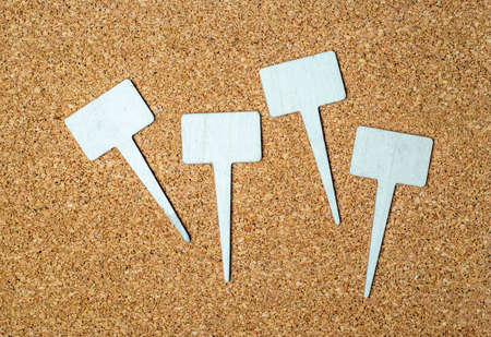 Wooden thumbtacks on cork board background. Top view.