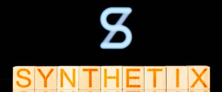 Synthetix. wooden blocks with the inscription Synthetix on the background of the cryptocurrency logo. defi concept