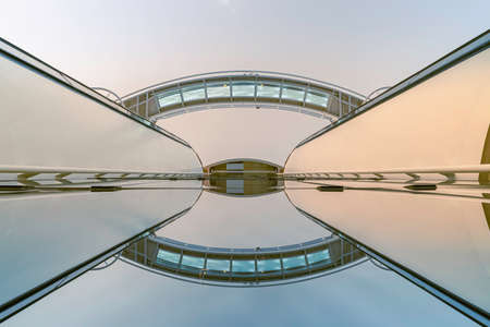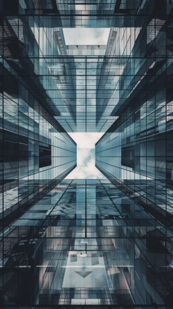underside panoramic and perspective view to steel blue glass high rise building skyscrapers, business concept of successful industrial architecture