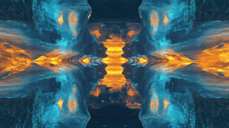Vibrant colors blend in a symmetrical pattern, reflecting orange hues against a dark blue background over still water.