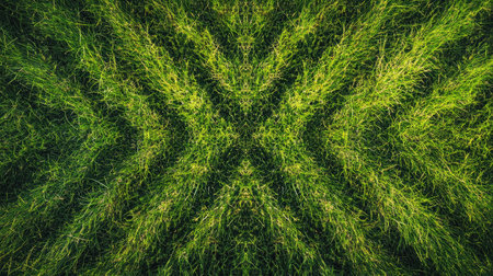 Top-down view of a green grass field with symmetrical patterns created by recent mowing.