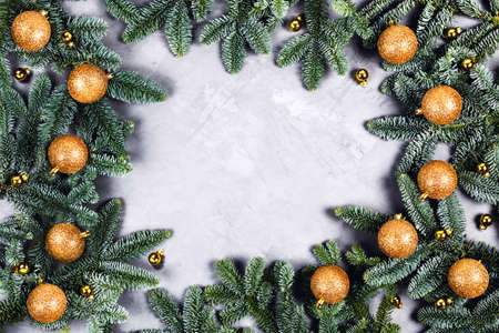 Christmas gray background with green fir brunches, golden and shiny Christmas balls with place for the text. Flat lay, top view.