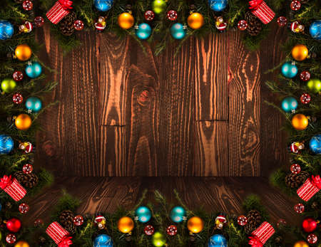 2017 Happy New Year seasonal background with real wood green pine, colorful Christmas baubles, gift boxe and other seasonal stuff over an old wooden aged background