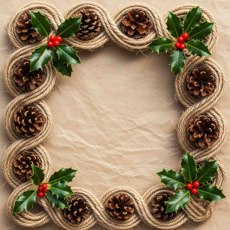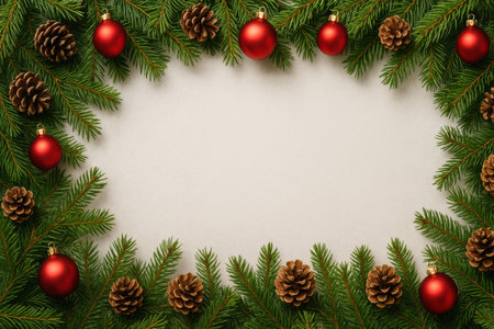 Festive Christmas frame decorated with pine branches, red baubles, pine cones, and berries for holiday celebration