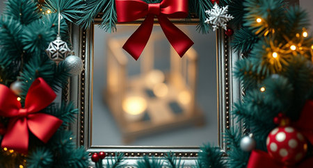 Festive holiday scene with fir branches, red ornaments, and soft lighting creating warm seasonal ambiance.